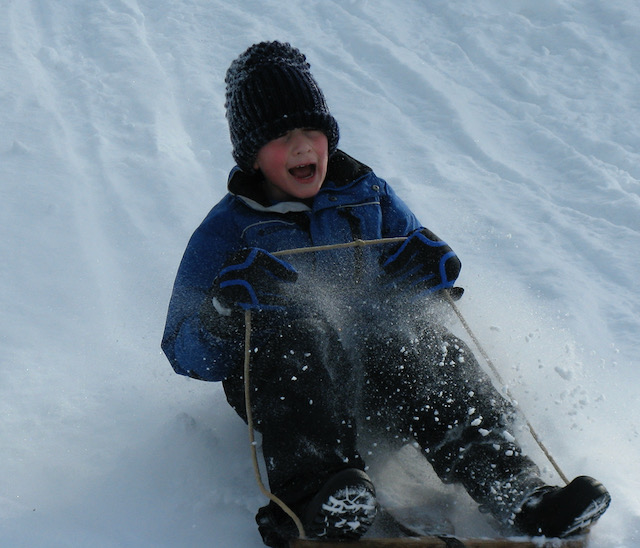 The children grew up, and now we were grandparents to three kids who lived in the flatlands of Illinois. But each one in turn, came to Wisconsin in the winter, and we made the trip to the golf course. It became a right of passage, that each one would have their first sled-ride seated on Grandma’s old sled with Grandpa behind, teaching them the joy of speeding down the hill on hard-packed snow. Then it was time for the solo ride. The clear blue skies, the sun making the snow sparkle like crystal, the vapor of our breath rising in excitement and laughter, these are sweet memories for me.