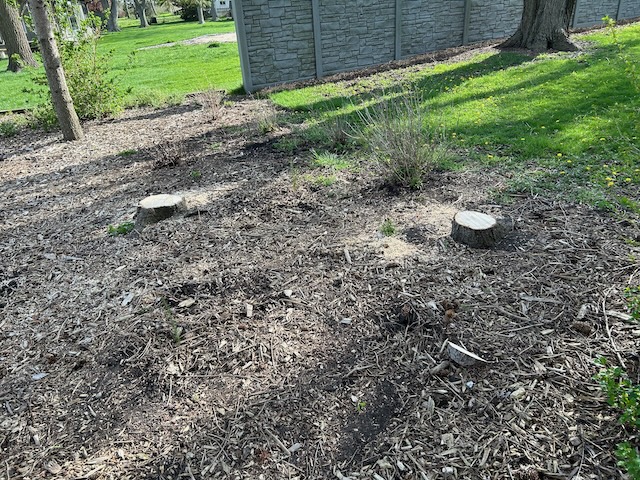 Both trees were dead, victims of old age and infringement from the neighbor’s willow tree, so it was time to remove them. I did exercise all the precautions that minimized the chance of damage to the house, and injury to me. A forty-foot tall tree requires a fifty-foot long rope looped around the trunk about eight feet off the ground. The other end gets tied to my lawn tractor and stretched tight in the direction I want the tree to fall. Then I cut a notch in the fall side, and finish with an angled cut on the backside so the trunk can’t jump back.